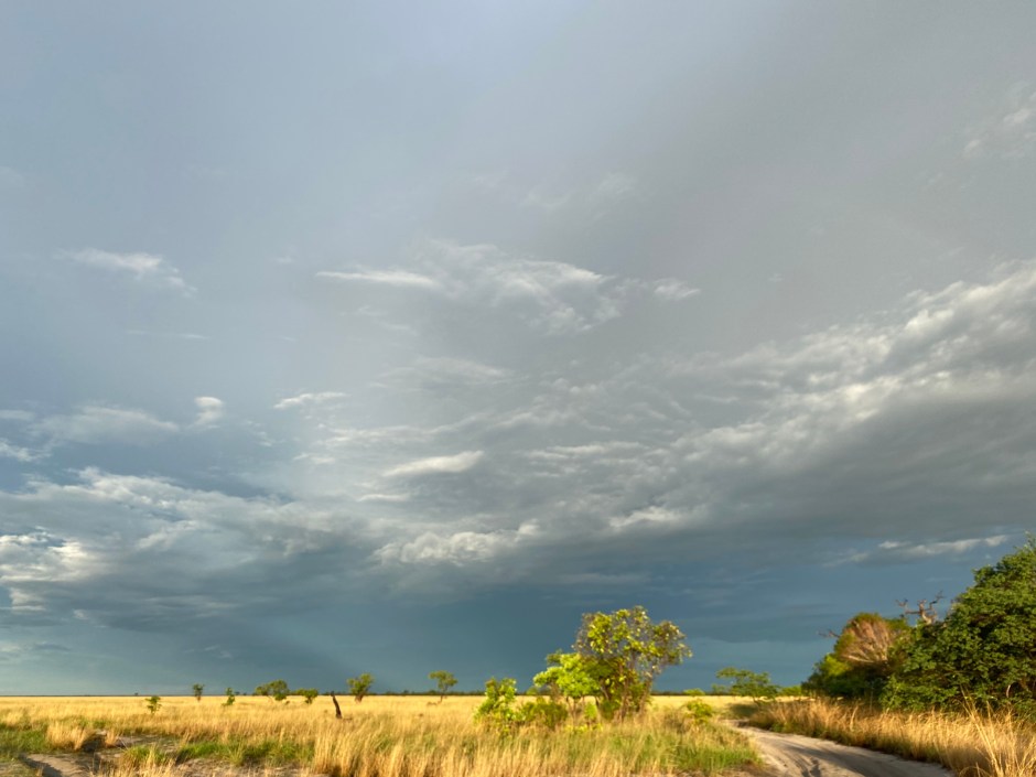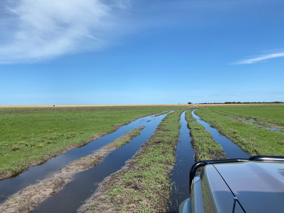 Auf einem Ponton ging es zum Liuwa Plains Nationalpark. Liuwa ist eine riesige Ebene, die in der Regenzeit für Monate unter Wasser steht. Bereits jetzt waren erste Fahrrinnen voll Wasser … vorher sammeln sich 40 000 Gnus und begeben sich dann auf den Weg nach Angola, einen Teil davon haben wir gesehen – sehr beeindruckend!