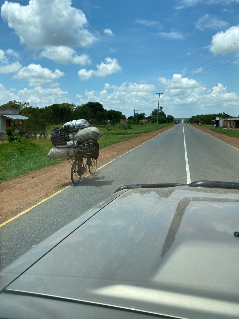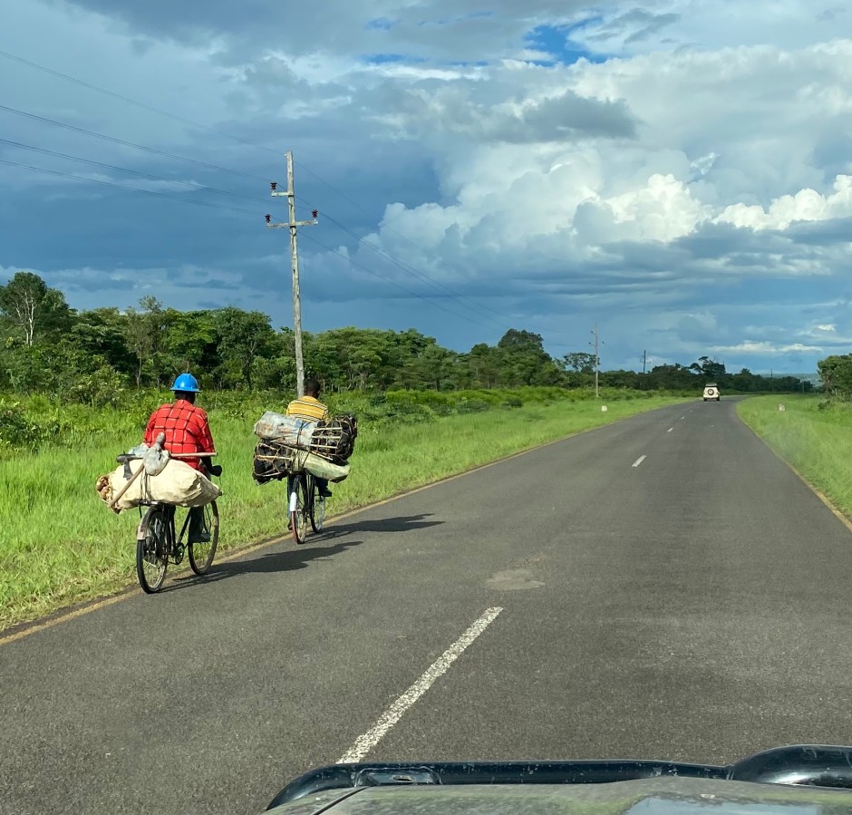 Wir sehen sehr viele Fahrräder auf den Straßen, sehr viel mehr als Privatautos, und das vor allem in den ländlichen Gebieten (die in Sambia dominieren). Auf den Fahrrädern wird eigentlich alles transportiert: ganze Familien, Einkäufe, Ziegen, Holzkohle und auch Pilze. Es ist beeindruckend, welche Distanzen auf den Fahrrädern zurückgelegt werden. Meistens fahren Männer und Jungs die Räder, Frauen und Mädchen sieht man selten auf dem Rad. Die Rolle der Frau in Sambia (wahrscheinlich auch mehr bezogen auf die ländlichen Gebiete) ist festgelegt auf die Essenzubereitung für die Familie, die Kindererziehung und die Bewirtschaftung der eigenen Felder. Dahingehend radeln die Männer auf stabilen Atlas-Fahrrädern durch die Gegend und erledigen die Besorgungen – der leichtere Teil der Arbeitsaufteilung?!?