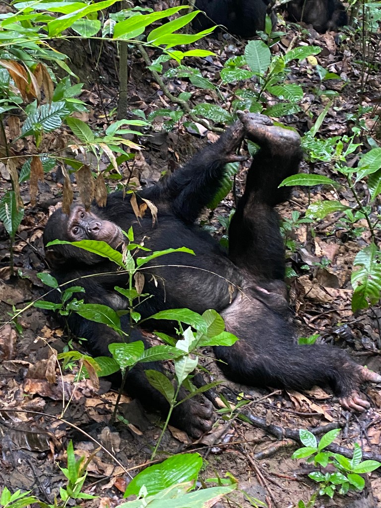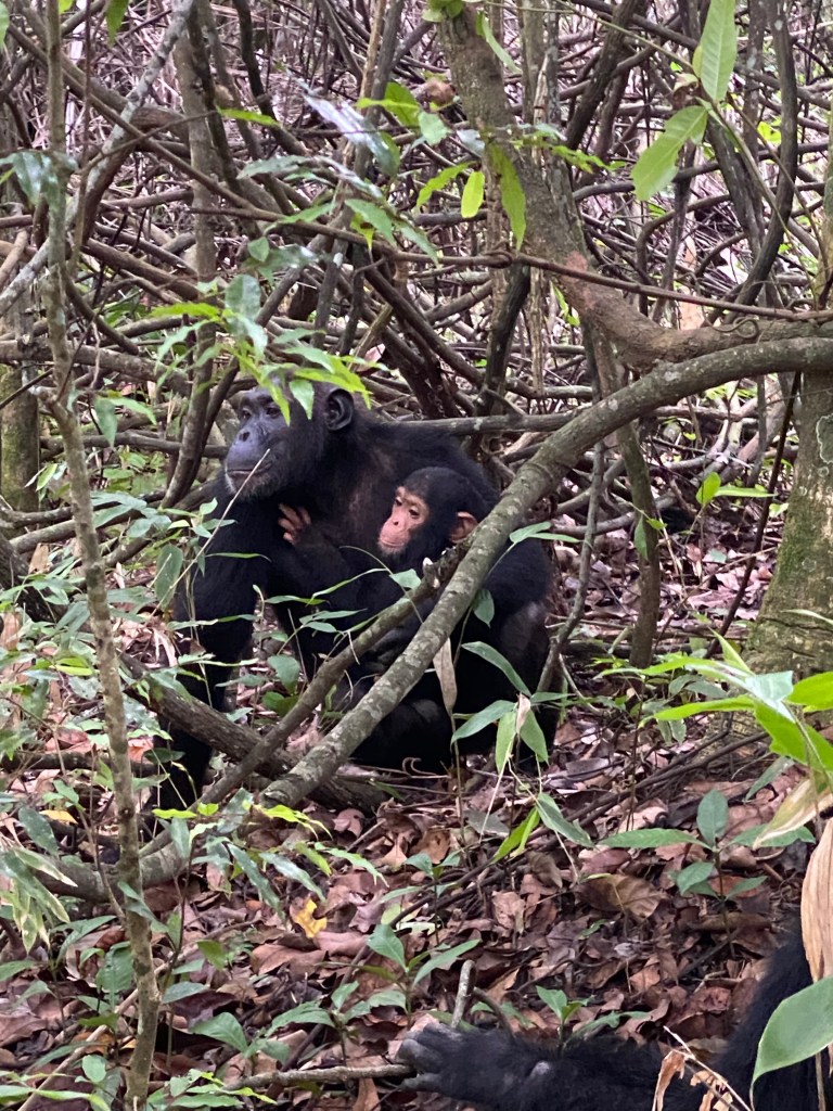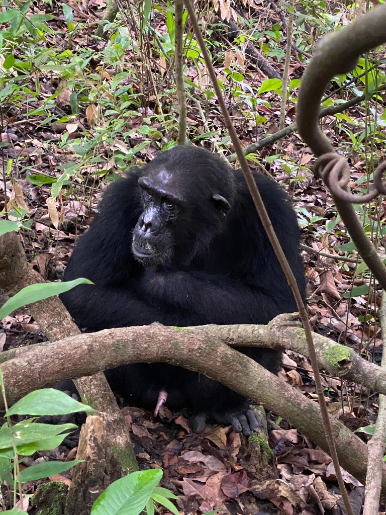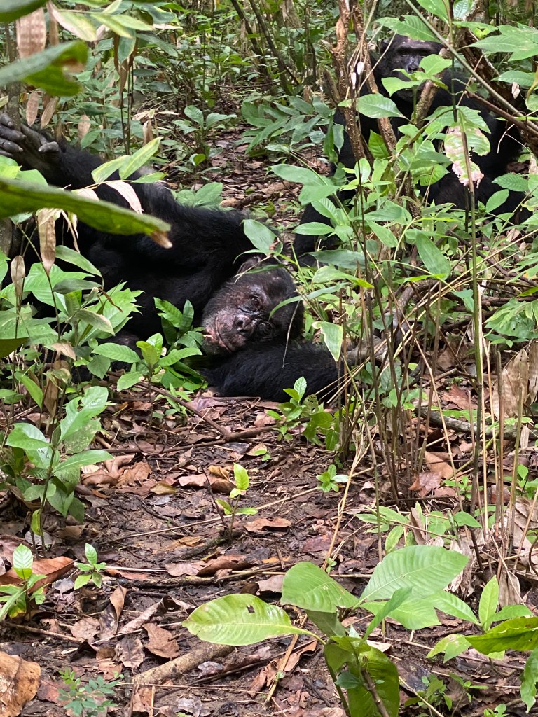 Am Morgen wurde es dann hektisch, wir mussten das Frühstück abbrechen, da die Schimpansen vom Tracker gefunden wurden und sich bewegten, die Berge hinauf. Es galt also, schneller zu sein als sie. Nach 40 Minuten teilweise quer durch den Wald fanden wir sie – und waren fasziniert. Wir durften eine Stunde mit den Schimpansen verbringen, ihnen beim Spielen, gegenseitig pflegen und kämpfen zuschauen und zuhören. Es ist irgendwie beruhigend zu wissen, dass die Anzahl der Schimpansen im Park wächst, derzeit sind es über 1000. Dieser Ort ist so weit weg von allem – genau so soll es sein!