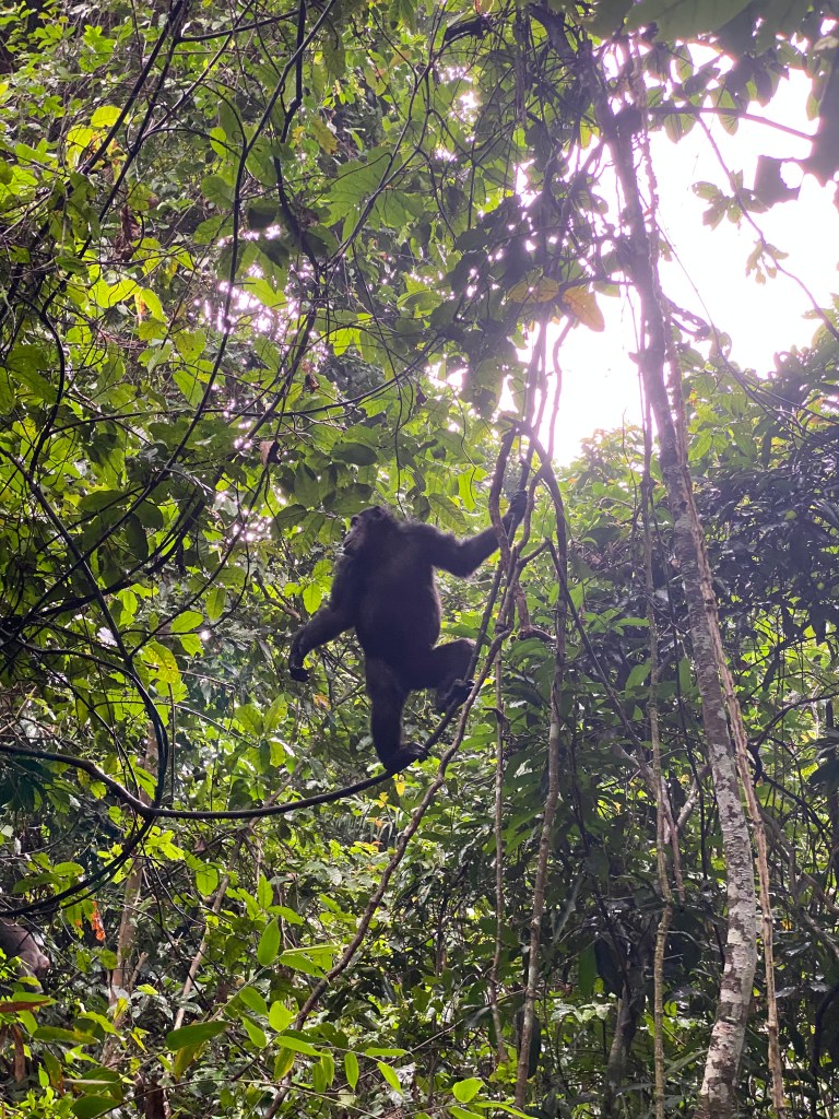 Am nächsten Morgen mussten wir viel länger laufen, teilweise auch sehr steil den Berg hoch und hatten dann wieder Glück – mitten im Wald (mehr noch als am Tag davor) haben wir die Gruppe wiedergefunden. Der Tracker hatte gute Arbeit geleistet! Die Stunde bei den Schimpansen war gefüllt mit Beobachtungen von Rangkämpfen unter den männlichen Tieren. Das derzeitige Alphatier, Primus, wurde herausgefordert, ein jüngerer Schimpanse hat mit Verbündeten versucht, ihn zu entmachten. Es war ziemlich laut und hektisch und wir mittendrin. Und plötzlich saßen die Schimpansen direkt über uns im Baum … Schimpansen sind doch größer als man denkt, und auch ziemlich kräftig! Da die Schimpansen dreimal mehr Kraft als Menschen haben, folgten wir den Verhaltensanweisungen des Rangers ohne zu zögern.