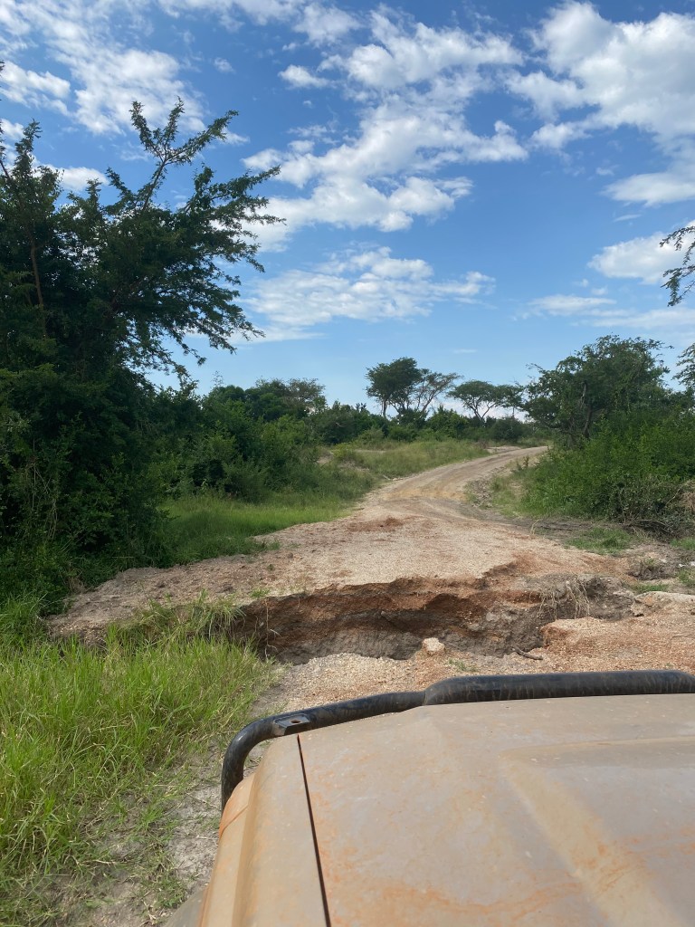 Gute Straßen wechselten sich mit schlechten Straßen ab und das erste Ziel war schnell erreicht – der Queen Elizabeth Nationalpark. Wir wussten nicht so richtig was uns erwartet, aber schon die Anfahrt war landschaftlich sehr schön. Teeplantagen wechselten sich mit Vulkankratern ab, auf denen Bananen angebaut wurden. Der ostafrikanische Grabenbruch war sehr sichtbar – von einem Kilometer auf den anderen fuhren wir steil bergab in den Grabenbruch hinein.