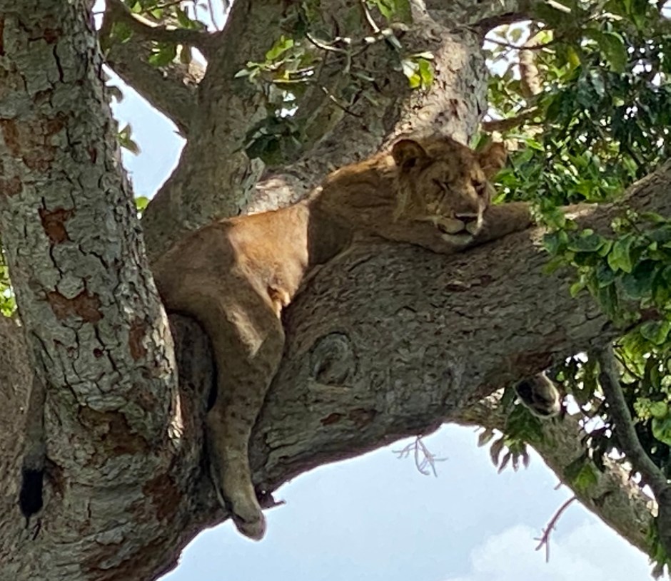 Wir ließen den nördlichen Teil des Parks hinter uns und fuhren zur Ishasha Region des QENP. Dort gibt es neben Akazien- auch Feigenbäume. Und in diesen Feigenbäumen liegen Löwen und ruhen sich aus. Auf den Ästen, hoch im Baum. Wirklich! Wir sahen 3 Löwen, wie sie im Baum abgehangen haben. Sehr interssant und spektakulär, wir kennen so etwas aus dem südlichen Afrika nicht. Es gibt nur 2 Gegenden in Afrika, wo Löwen sich auf Bäumen aufhalten, einmal im QENP und einmal im Lake Manyara Nationalpark in Tansania.