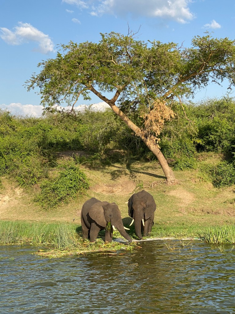 Bumpy gravel roads and very good tar roads in between got us towards Queen Elizabeth National Park (QENP). We started the year with a boat cruise on Kazinga Channel, a channel connection Lake George and Lake Edward. I am already confused with all the British Monarchy names …