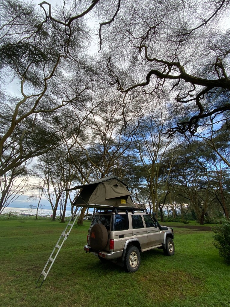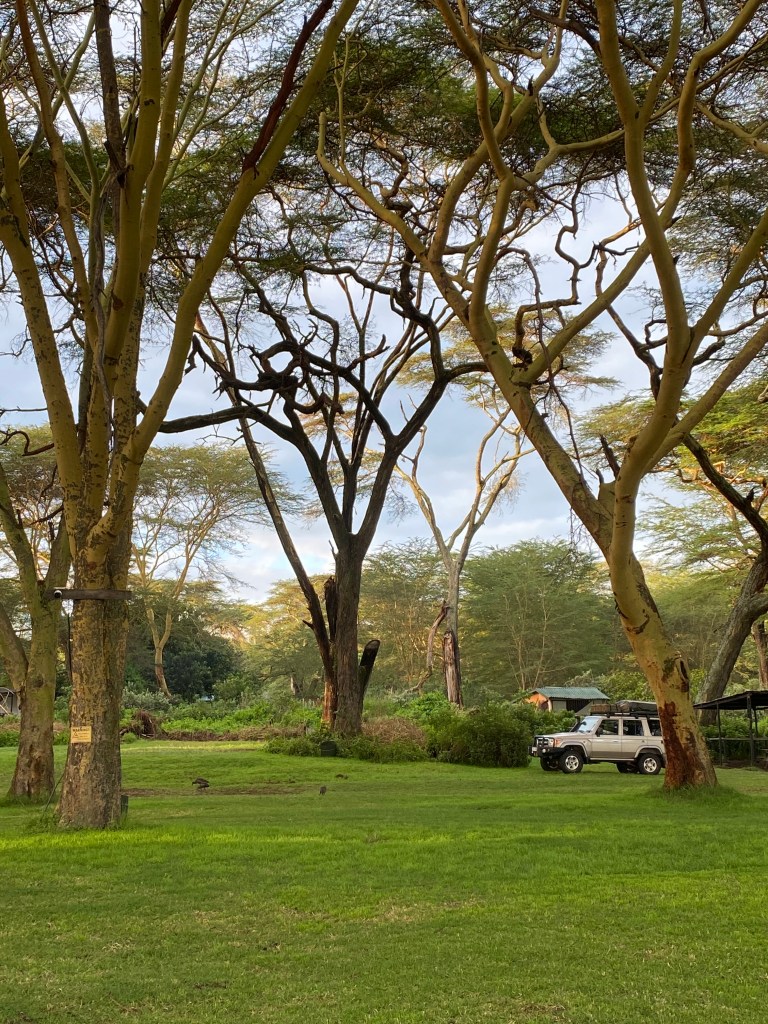 From the Masai Mara we drove to Lake Naivasha for a stop over. Lake Naivasha is a freshwater lake in the Rift Valley and because it is a freshwater lake, home of the huge rose production sites – roses cut at Lake Naivasha in the morning can be in Europe at the auction the same evening! We took the rain along so we did not see much, and the Flamingos we were aiming at have left the area anyway because of the high water levels. Anyway, we spent a lovely afternoon watching the rain from a cosy terrace at Carnelley’s Camp at Lake Naivasha, they even lit a fire in the evening as it was quite chilly.