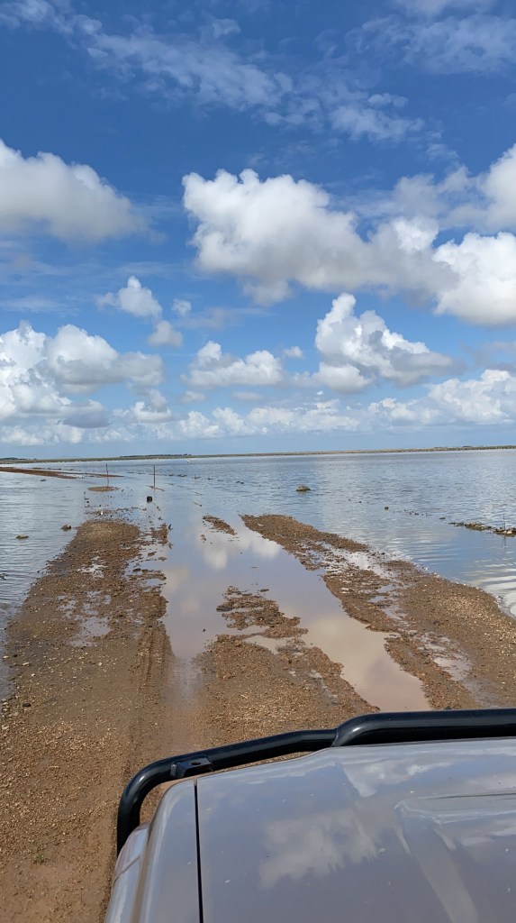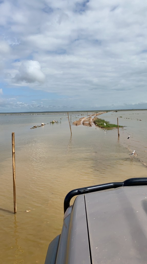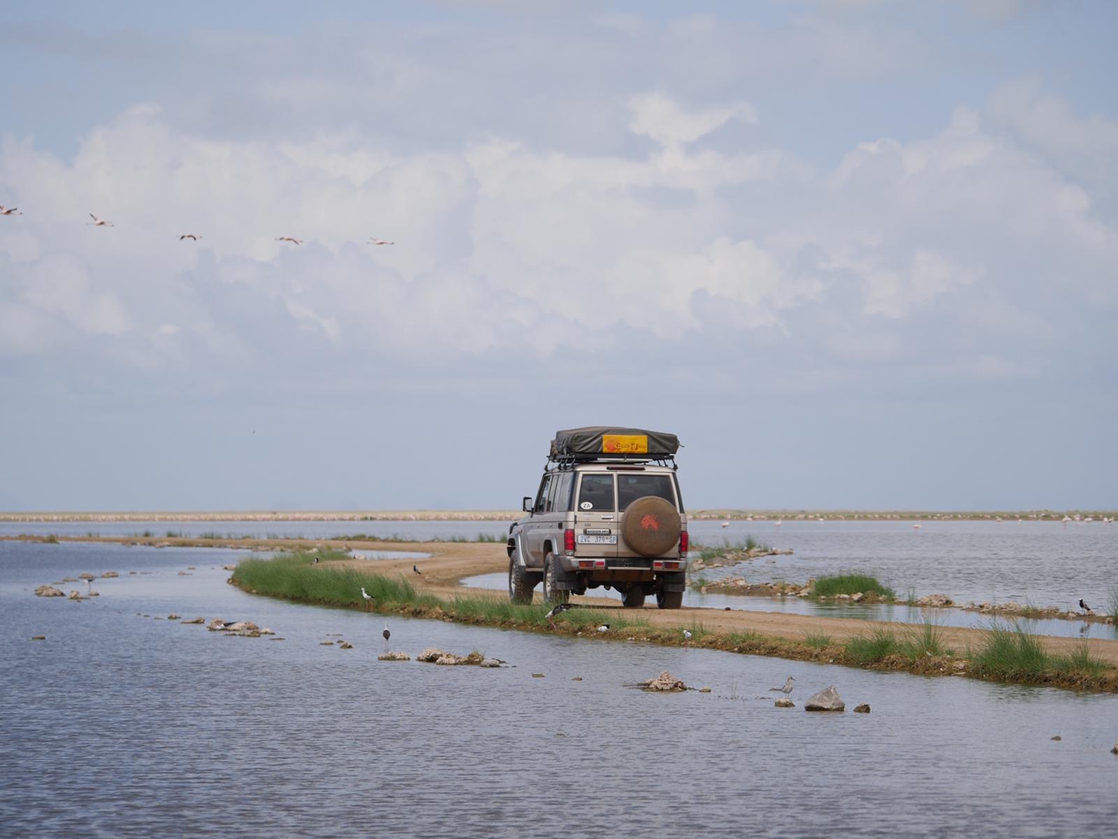 The heavy rains also hit Amboseli and we encountered flooded plains that usually are dry grassland. In the shallow waters, the flamingos find plenty of food and so we found plenty flamingos 🙂 Next destination in the park was observation hill, the highest point and an area, we we were allowed to be outside of the cars. And getting there was a challenge! The roads were flooded as well, with the lake extending so much that only poles showed the way. I (Christian) and the Cruiser could not resist and headed for the fun …