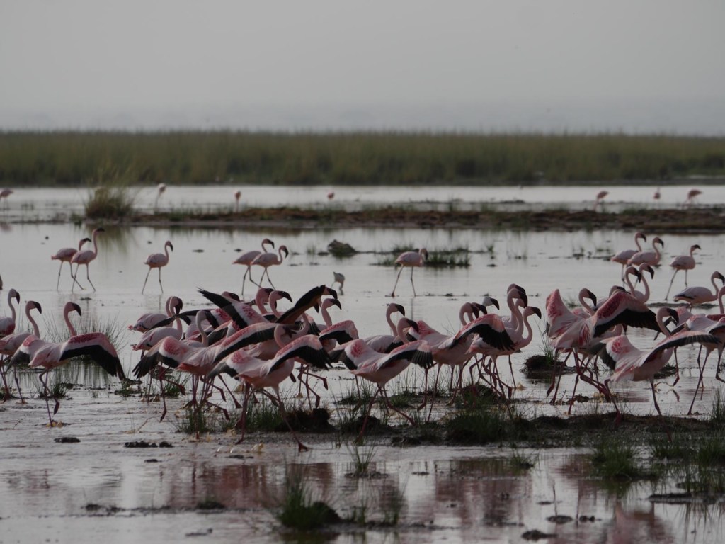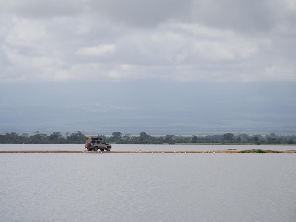 Der Regen hat auch im Amboseli Spuren hinterlassen. Die Ebenen waren zum Teil stark überflutet, das zieht die vielen Flamingos an und wir waren sehr happy, sie so zahlreich zu sehen. Und dann waren da die Wege, beziehungsweise sie waren nicht mehr da. Ich (Christian) und der Cruiser freuten sich auf die Wasserschlacht quer durch den Park 🙂