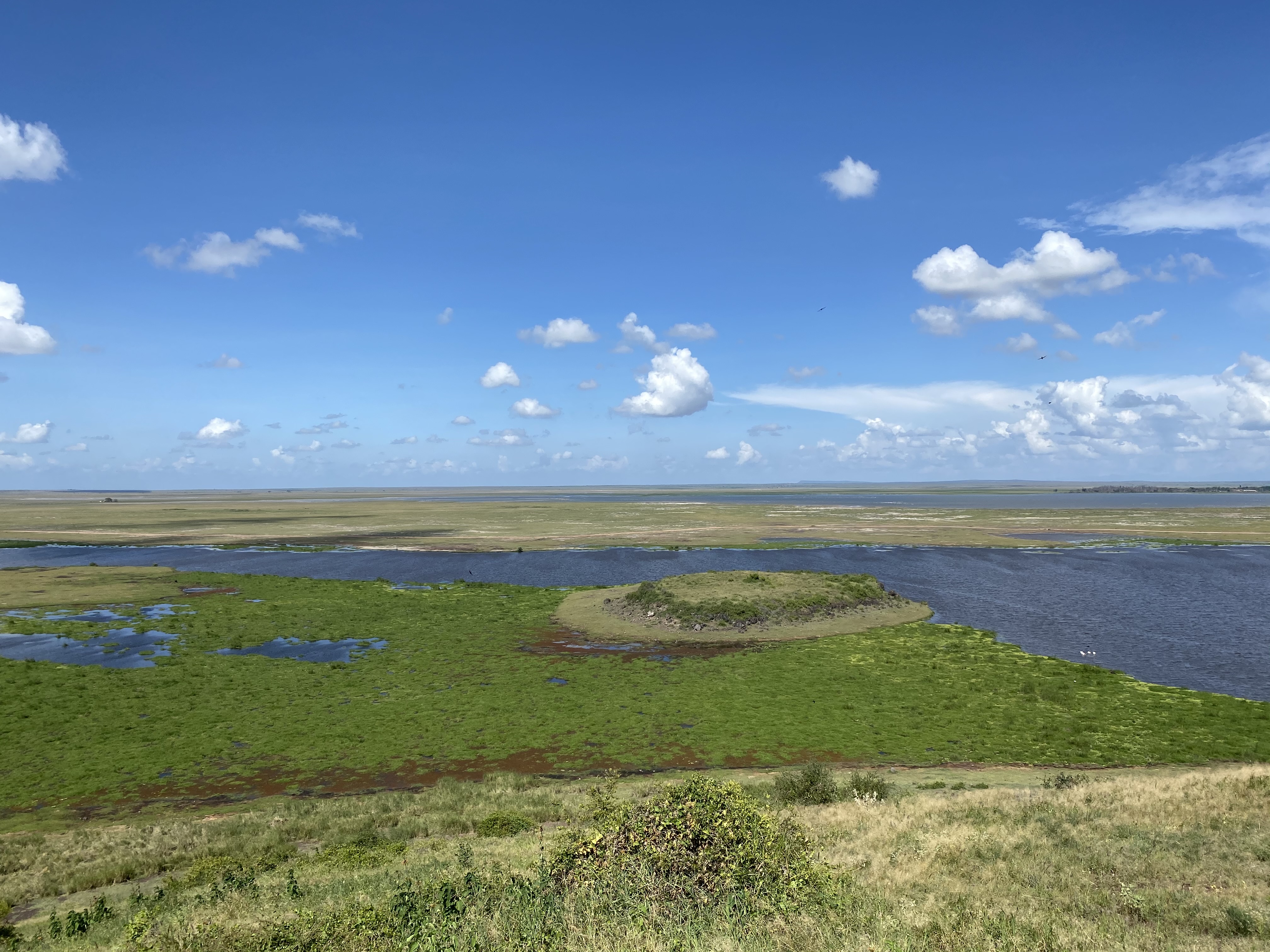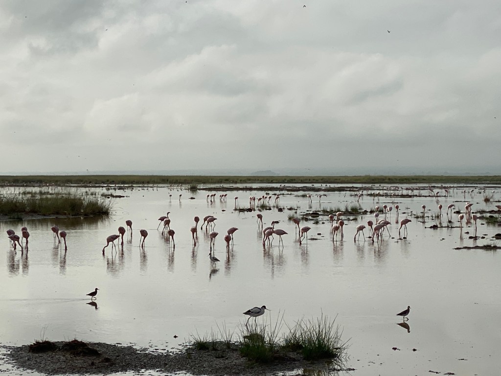Von der Masaai Mara aus fuhren wir erst zum Naivasha See, ein Süßwassersee des ostafrikanischen Grabenbruchs. Das Wasser wird intensiv genutzt, vor allem für die Produktion von Rosen und anderen Schnittblumen für den europäischen Markt. Rosen, die morgens am Naivasha See geschnitten wurden, können abends bereits auf den Blumenmärkten in Europa verkauft/versteigert werden. Das Wetter am Naivasha See war leider nicht gut, der Regen ließ nicht nach und die Flamingos, die wir unbedingt sehen wollten, waren nicht da, so sind wir früher weiter Richtung Amboseli Nationalpark gefahren. Den Nachmittag verbrachten wir dann auf der überdachten gemütlichen Terrasse von Carnelley’s Camp, mit Blick über den See und auf die imposanten Regenwolken.