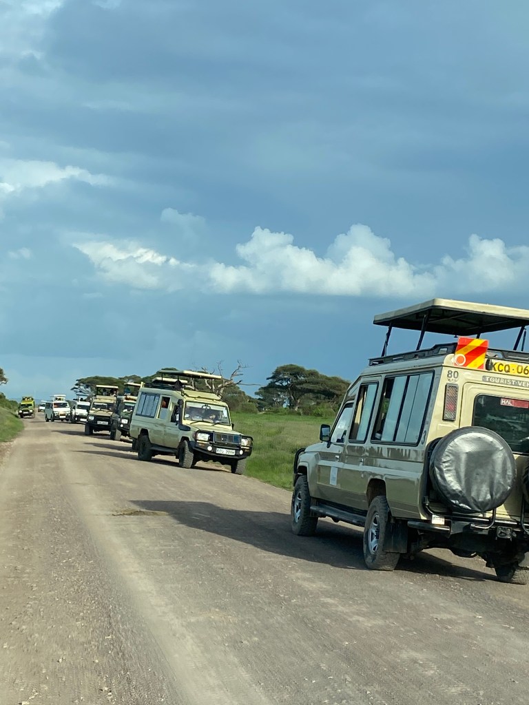 Die Route führte südlich an Nairobi vorbei, inklusive Verkehrschaos und Polizeikontrollen. Manche liefen gut, andere Begegnungen waren nicht so freundlich. Nach einem kurzen Kaffee- sowie Einkaufsstop (inkl. Einlasskontrolle vor dem Parkplatz des Einkaufszentrums mit dem Check nach Waffen und anderen Dingen im und unter dem Auto…) reihten wir uns auf der Nairobi/Mombasa Autobahn hinter unzähligen LKW ein. Nach einem Stopp an der Autobahn (wer sagt, dass man die LKW nach einer Weile nicht mehr hört? Stimmt nicht! Ohne Oropax ging gar nix!) ging es sehr früh weiter Richtung Amboseli.