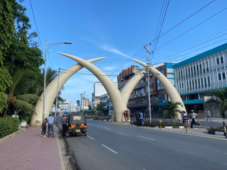 Shareef zeigte uns dann noch die Altstadt von Mombasa mit sehr alten, oft verfallenen, aber trotzdem schönen Häusern, vielen Läden, Moscheen und einem Restaurant am Wasser, wo wir leckeren Fisch zum Mittag aßen. Später haben wir noch den Gewürzmarkt und dem Hindu Tempel besucht. Den Abschluss bildete der Besuch bei den riesigen Elefanten Stoßzähnen (aus Beton), die zu Ehren von Queen Elizabeth errichtet wurden.