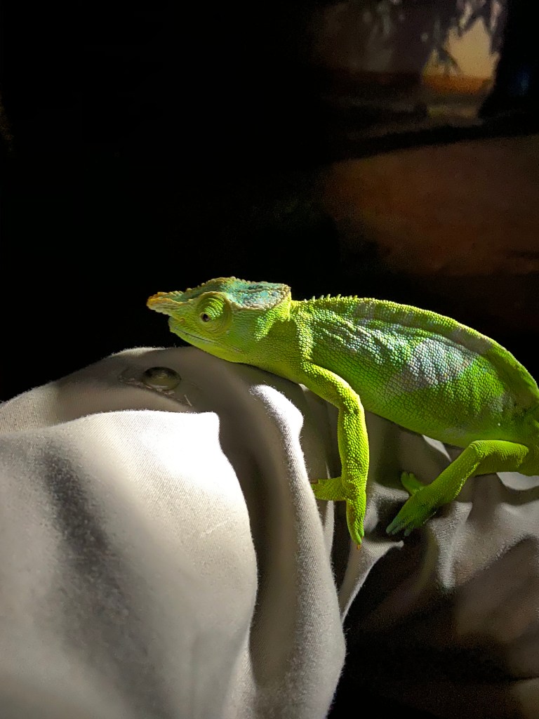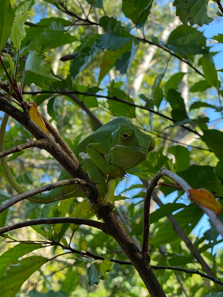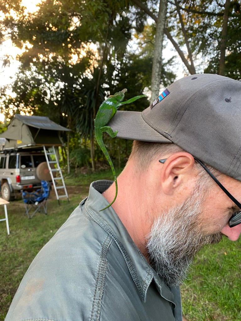 Zwei Arten haben wir in den Büschen und Bäumen direkt vor dem Parkbüro gefunden. Und da Chamäleons gern länger über mehrere Tage hinweg in der gleichen Lokalität abhängen, hatten wir zwischenzeitlich das Gefühl, dass sie dort platziert wurden 😉 So oder so hatten wir viel Spaß beim Suchen, Beobachten, Fotografieren und haben uns auch gern als Klettergerüst hergegeben.
