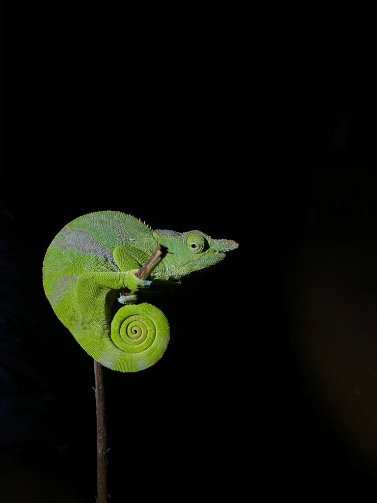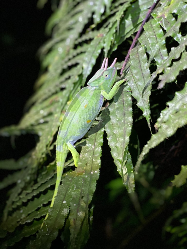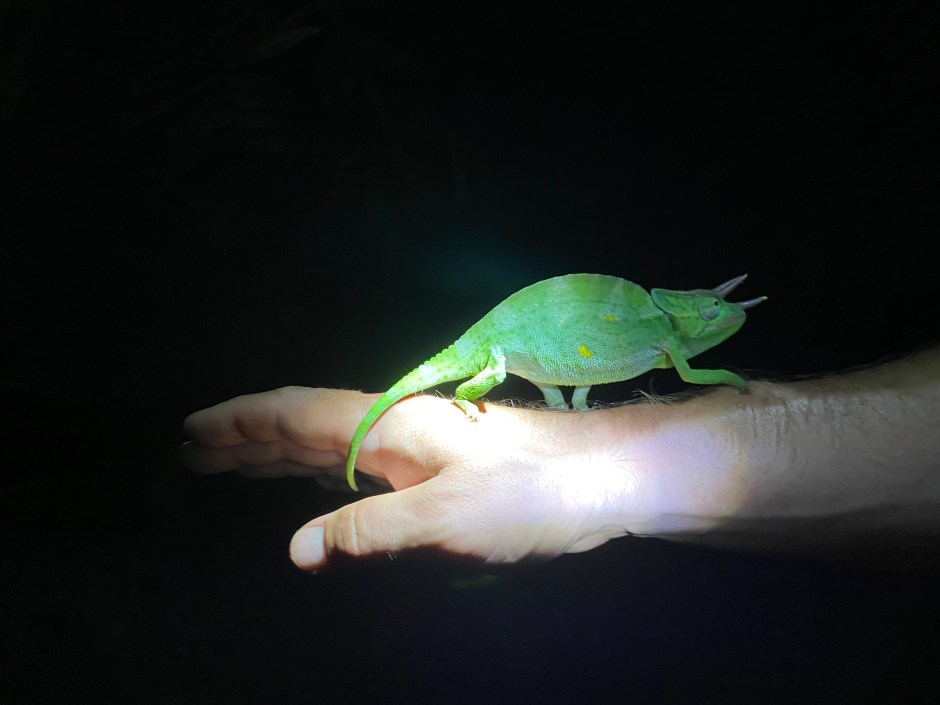Und genau deshalb waren wir hier – wir wollten eine Chamäleon Safari machen. Alois holte uns kurz nach 19 Uhr ab und wir machten uns auf dem Weg in den Wald. Chamäleons leuchten weiß im Dunkeln wenn man sie mit einer Taschenlampe anstrahlt, daher sollten sie theoretisch leicht auffindbar sein. Und so war es dann auch! Wir haben vier der acht Arten gesehen, inklusive des 3-Horn-Chamäleons.