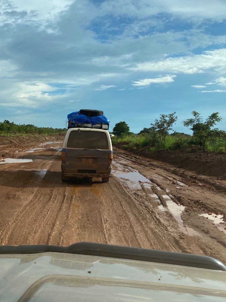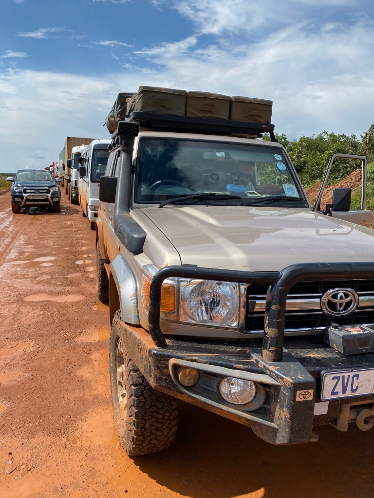 The potholes were bad. Again VW Polo big and deep and muddy due to the heavy rains. Christian drove the Cruiser like a Go-Kart and was super successful in overtaking the trucks. And then the loooong stretches of mud came. The idea of using stones to prevent the mud road to dissolve completely is generally a good one, but if the stones are too big, trucks might get stuck on them.
