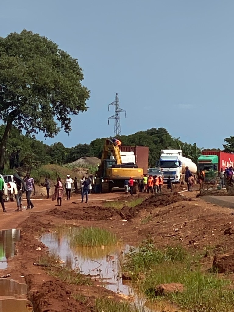After 2,5 hours the truck suddenly moved after pulling it away from the stones underneath, the Pajero got pulled out of the mud as well and now the only obstacle was that the traffic was piling up in the lane for the oncoming traffic as well. Not sure how, but a brave flagman got everyone in one line and directed traffic very well.