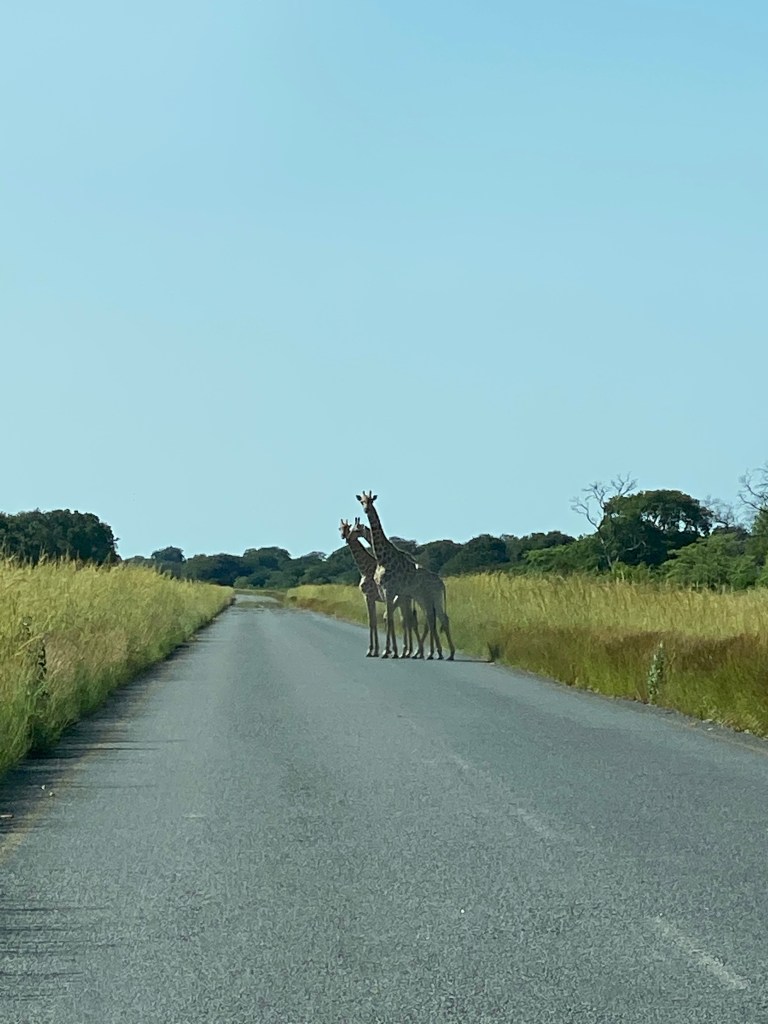 Wir haben die Gegend um den Chobe Nationalpark im Norden von Botswana hinter uns gelassen und damit auch die vielen Elefanten. Aber wir mussten nicht lange auf Ersatz warten, Giraffen begrüßten uns auf der Autobahn und wir waren froh, nicht die Maximalgeschwindigkeit gefahren zu sein. Obwohl 120kmh natürlich toll klang nach drei Monaten mit wesentlich weniger!