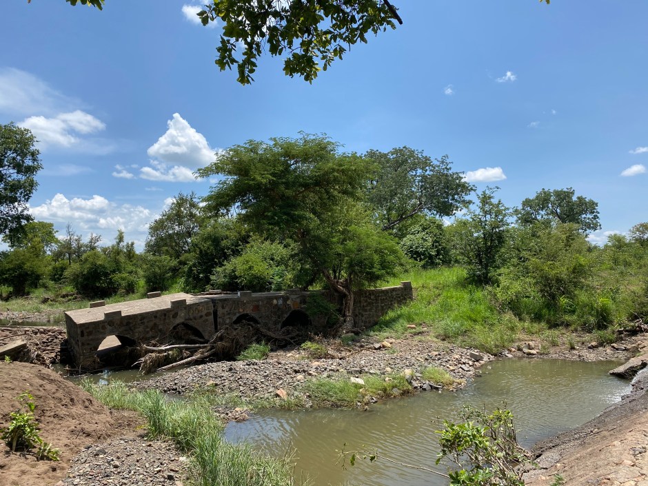 Die Teerstraße endete an der Grenze auf der Botswana Seite, in Simbabwe führte sie als schmaler unbefestigter Weg mit hohem Gras. Damit sich die Samen nicht im Radiator verfangen und dann bei der Hitze anfangen zu brennen, haben wir ein Netz vor den Motorblock gespannt. Die Fahrt in Richtung Park (56km) war ruhig, kein Gegenverkehr, nur tolle Landschaften und weggewaschene Brücken…