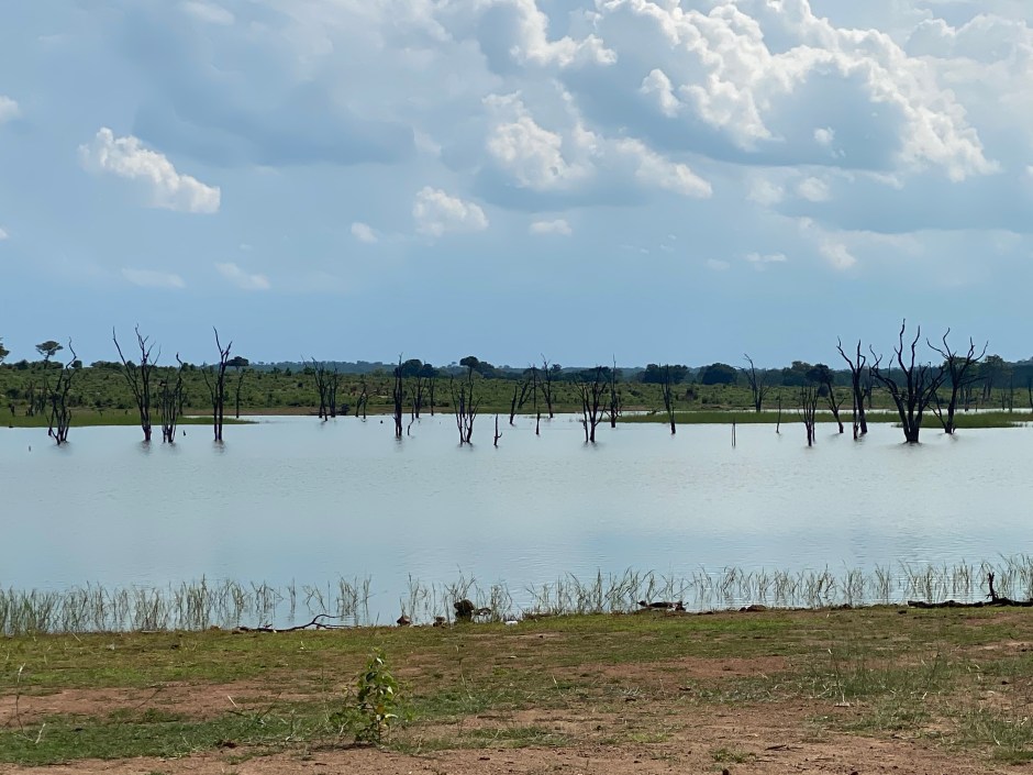 Unsere nächste Nacht verbrachten wir am Deteema Damm, eine Gegend die für Löwen bekannt ist. Dort trafen wir auch auf ein (lustigerweise wieder holländisches) Paar und hatten einen schönen Abend mit Blick über den Damm sowie am Lagerfeuer. Da wir alle sehr früh aufstehen wollten (einerseits um nach den Löwen zu suchen, andererseits um eine Safari zu Fuß zu unternehmen), sind wir früh ins Bett. Die Regenwolken haben den Nachmittag und Abend einen Bogen um uns gemacht … noch!